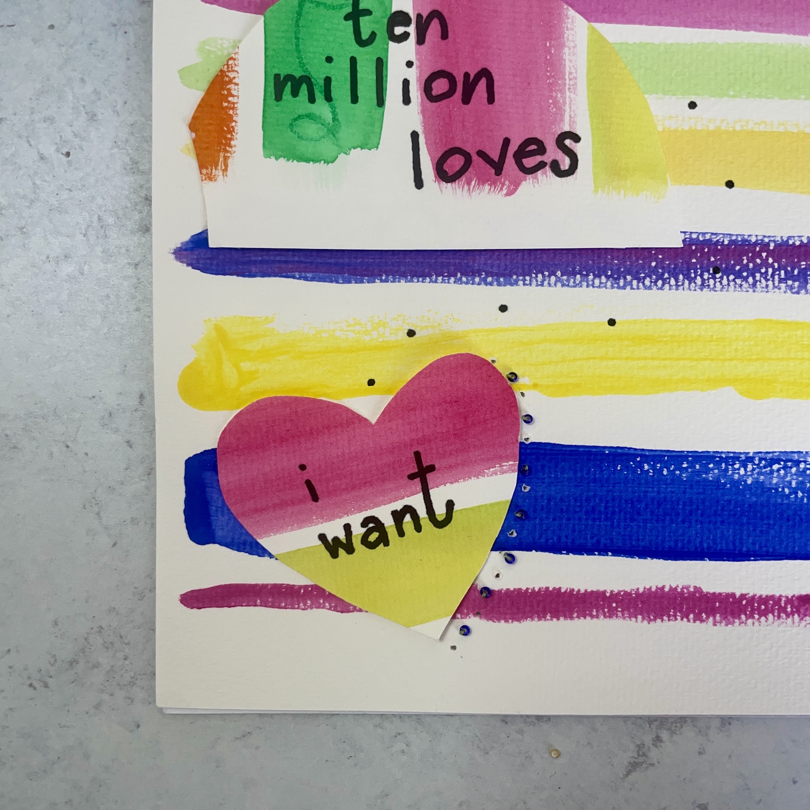 striped painting with lyrics, beading and stitching and song lyrics drawn on layered shapes
